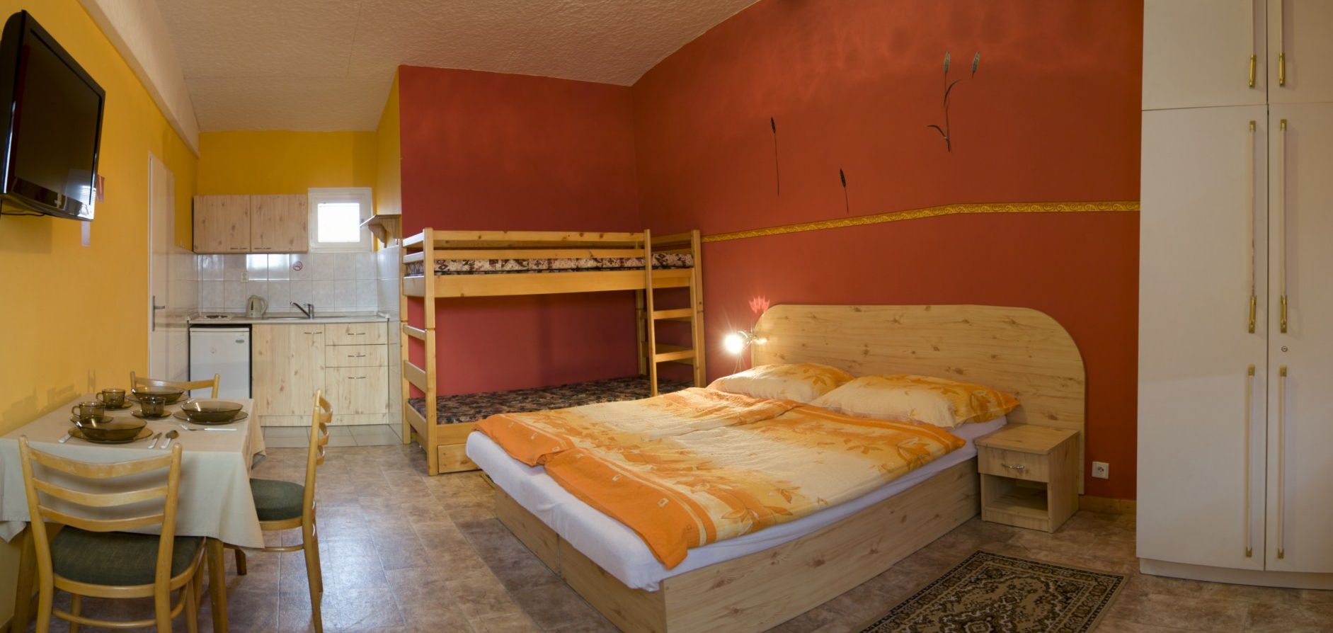 | Obývací ložnice (25 m2, 1 x manželské lůžko, 1 x patrové lůžko, kuchyňský kout, jídelní kout) |
